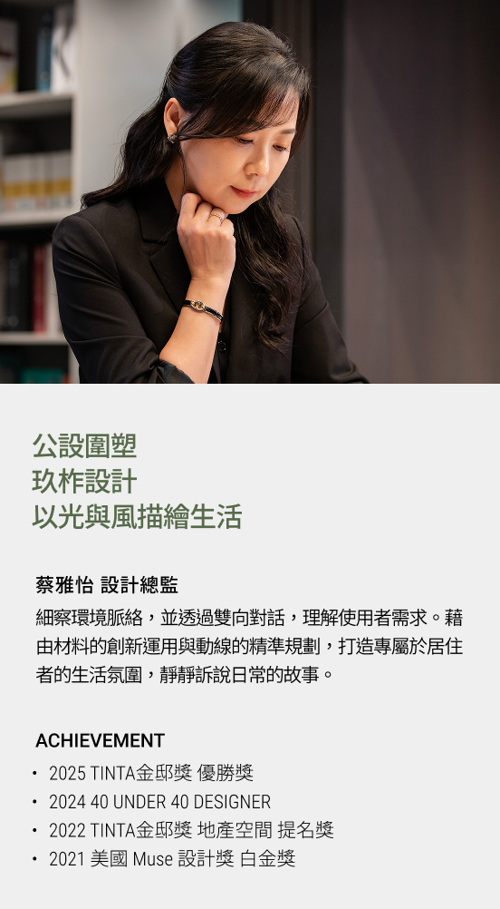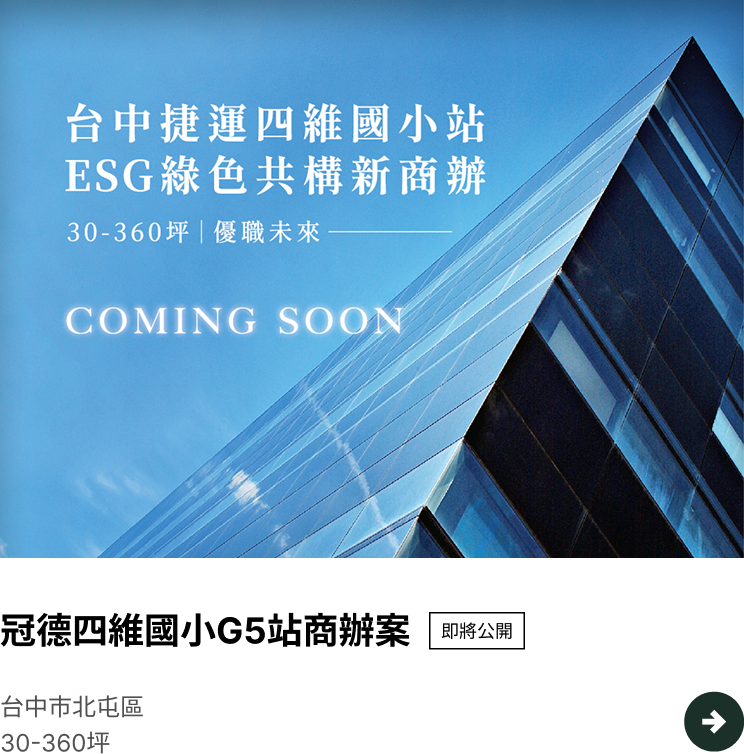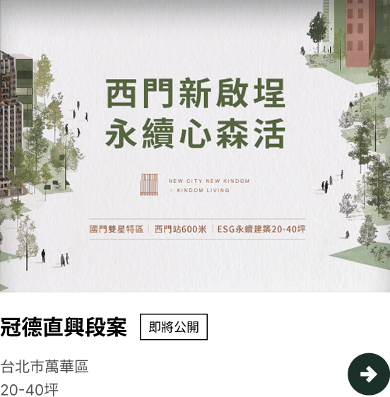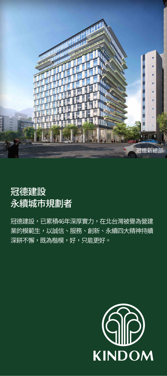 扎根北台中,勾勒天際輪廓,宜居陽台與複層露台層層築綠,如大樹展枝向城市舒展。冠德於台中的首座ESG.候選黃金級綠建築,透過共享設計重現「埕式生活」的人情溫度,以永續為核心,讓建築與世界對話,為城市共好奠基,包容生活,傳承世代。